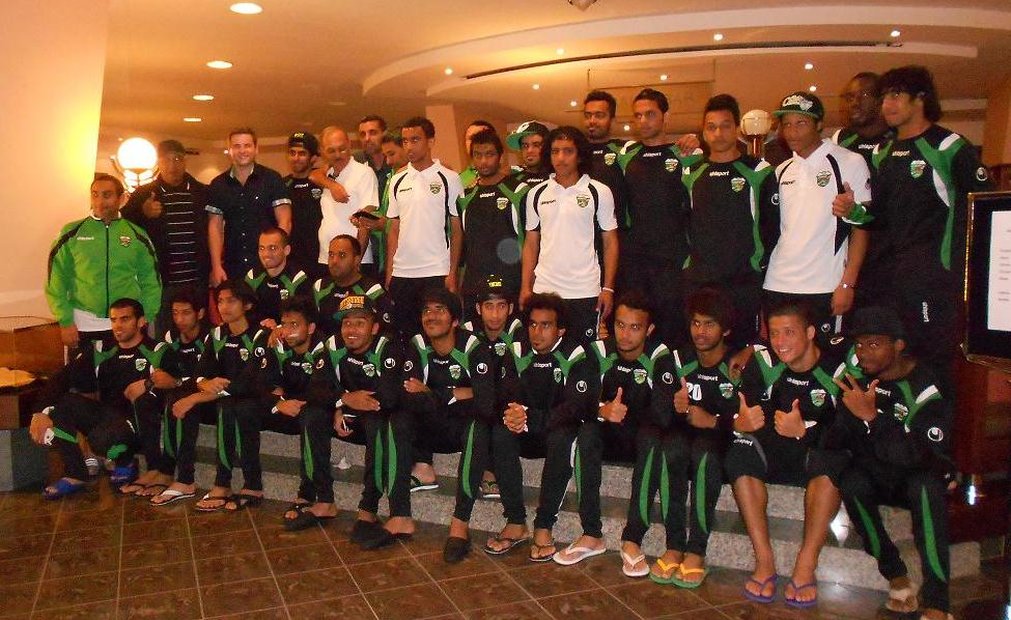 Hradec Králové / ČR, 17. září 2013 - Fotbalisté ze Spojených Arabských Emirátů se připravovali v České republice na fotbalovou sezónu i dubajský Královský fotbalový pohár. Mladí hráči strávili v královehradeckém hotelu Černigov tři týdny, trénovali na zdejším stadionu a sehrály čtyři přátelská utkání. Fotbalový trenér odměnil na důkaz spokojenosti hotelový personál symbolickou trofejí a vlaječkou svého týmu.