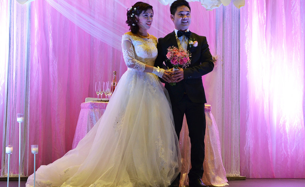 A festively set table and a hall decorated with white flowers and pink valerians awaited more than 500 wedding guests at the Clarion hotel in the town of Ostrava on Sunday, 11 January 2015. The wedding date according to Vietnamese tradition was determined according to the lunar calendar and the age of the bride. The arrival of the newlyweds was announced around 6 p.m. by extravagant fireworks in front of the Clarion hotel. The bride and groom on stage first greeted the guests and then handed the stage over to their parents, who in front of friends and family wished them good luck in their life together.